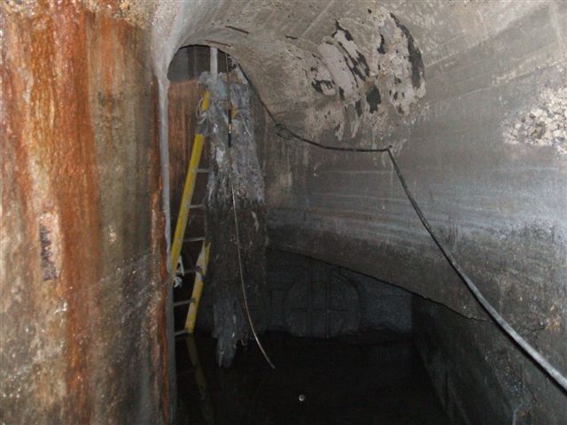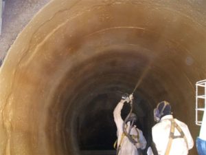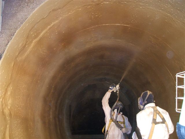 After the floor repair was complete, along with the removal and preparation of an unanticipated coffer dam, Spraywal was ready for application. Some of the 10-foot sections required the use of a swing harness. Applied at 1,250 ml. using concrete nails to measure the thickness, the sewer section would take up to 16 hours of continuous spraying to complete. The east and west sections would take 32 continuous spraying hours to finish.