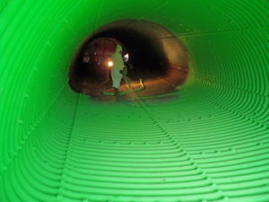 Spray Shield Green II, a semi-rigid bio-based polyurethane…To achieve the application of the Spray Shield Green II lining the large amounts of sediment and debris in the entire length of both pipes needed to be removed. Active water flow was by-passed by constructing coffer dams that diverted water flow underneath the highway through the adjacent culvert. Many bolt heads and sheet plate joints that make up the construction of the steel culverts required the spray applicator to focus extra attention on achieving full coverage onto these multiple profiles while striving to hit a fast pace project completion date.
